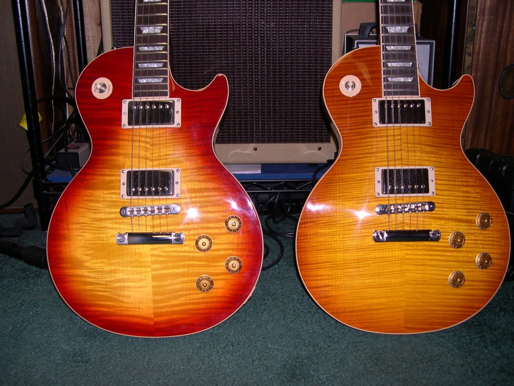 Not too much difference in sound. The cherry has the original bursrbuckers, but the honey has been fitted with Classic 57s and sound a bit like the reissues...not quite as bright. I can get them pretty close by dialing in whatever amp I'm using.