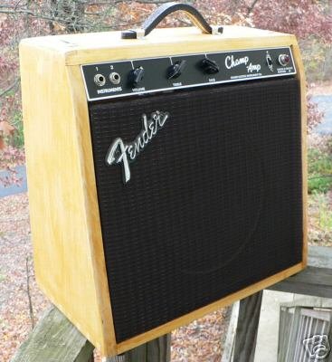 Old Champ in a homemade cab. 10" Jenson speaker. Good recording and house jam amp. I usually use a Boss RV-5 reverb pedal with it. Also an MI Audio Crunch Box or my old Boss OD-2 Turbo Overdrive for some crunch. The OD-2 was purchased used in 1979 and aftery trying lots of different pedals through the years, I keep coming back to this one.