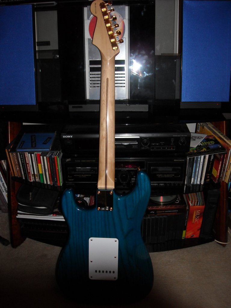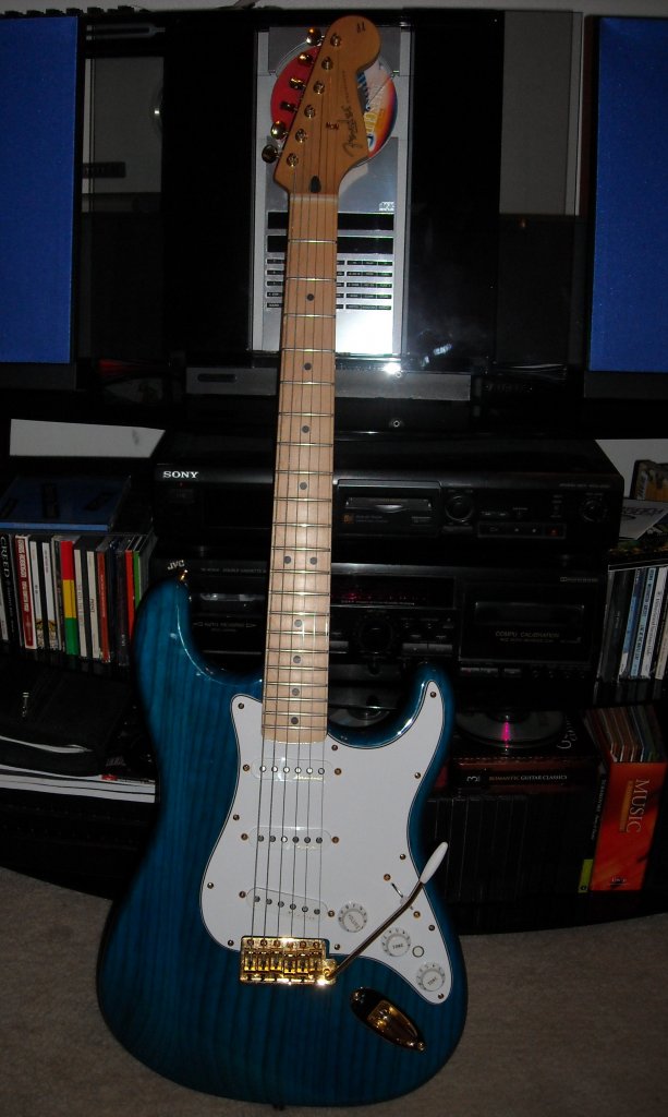 My first Fender and my first Stratocaster. I hated the original tortoiseshell pickguard, so I attempted to paint it which I failed at miserably. So I used a Proline pickguard that I bought from GC and had to route some holes in the body to get the pickguard to line up right. I also had to route a hole in the pickguard for the switch.