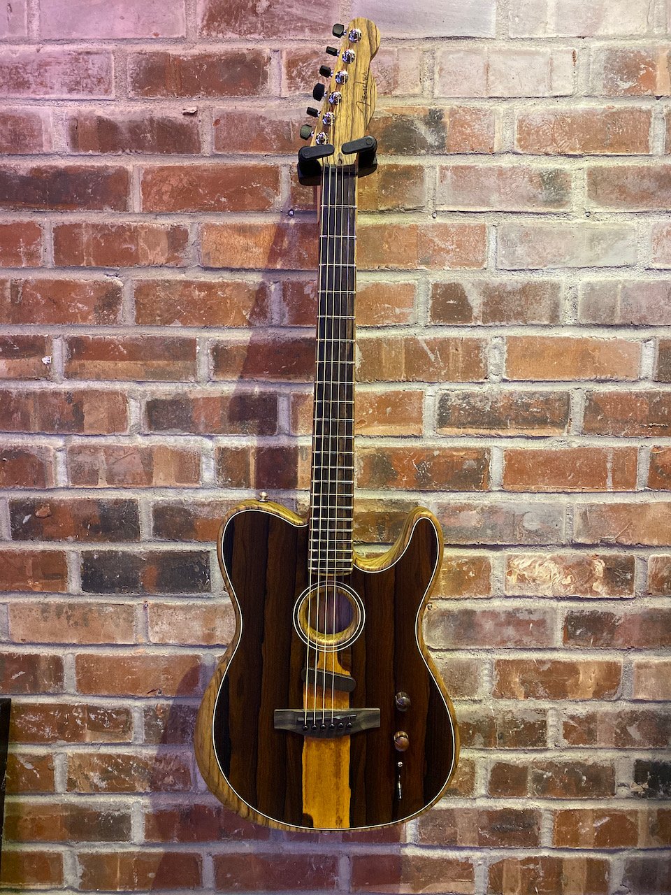 The American Acoustasonic Telecaster Ziricote features a wood that is similar visually to rosewood, but carries grains with shades of gray and olive greens. It is known for having deep, rich bass tones and clear trebles.