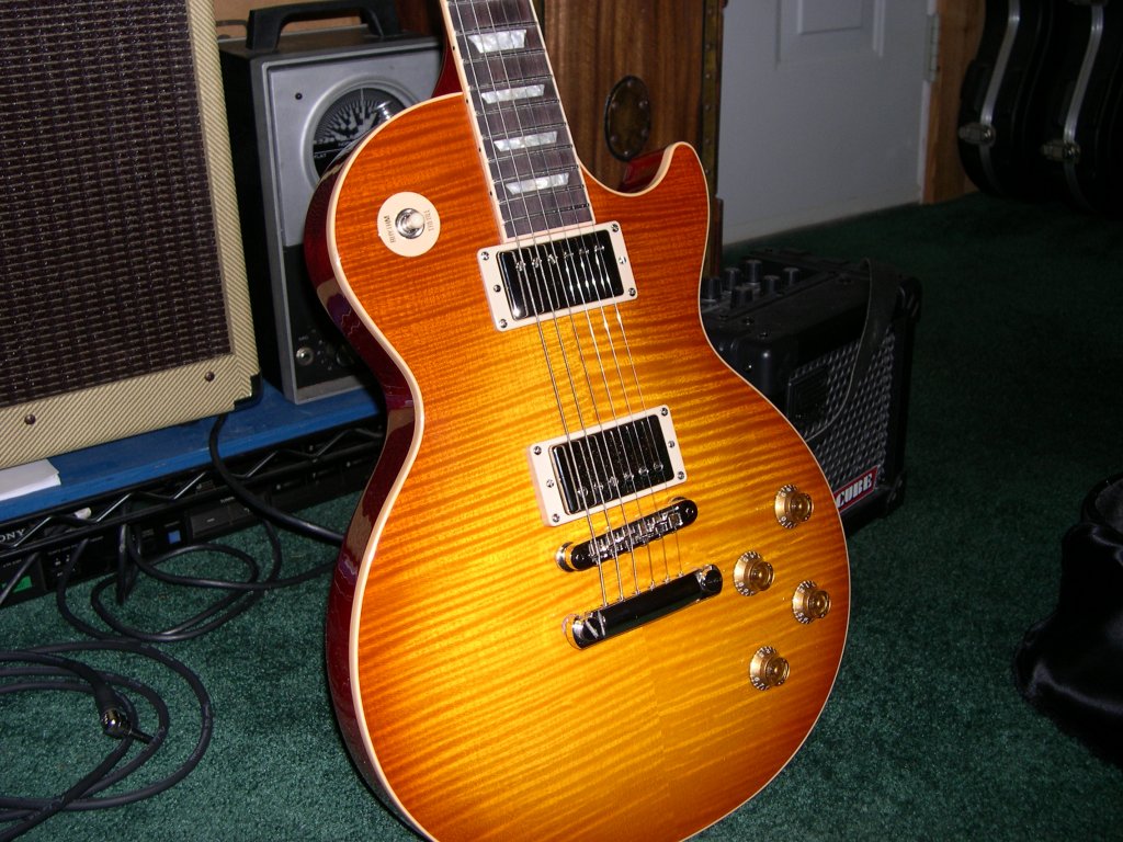 Not too much difference in sound. The cherry has the original bursrbuckers, but the honey has been fitted with Classic 57s and sound a bit like the reissues...not quite as bright. I can get them pretty close by dialing in whatever amp I'm using.